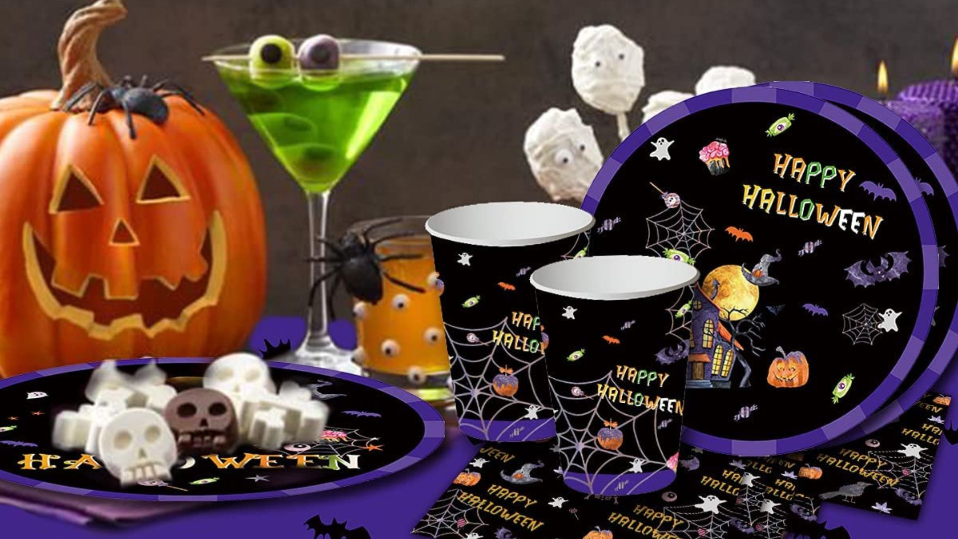 Se molte idee di questa lista sono sicuramente opzionali, piatti, posate e tovaglia a tema non possono mancare per una festa di Halloween a tema. Un kit unico è senz’altro più pratico, perché permette di coordinare tutti gli elementi tra loro ed evita la scomodità di doverli reperire singolarmente. Ma come riempire questi piatti? Se hai bisogno di spunti ai fornelli consulta le nostre idee per ricette salate di Halloween sorprendenti!
